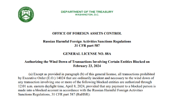 OFAC同時出具了通用許可證,批準牽涉這些實體的相關(guān)交易在特定條件下及/或緩沖期內(nèi)(東岸夏令時間 2024年4月8日中午12:01之前)繼續(xù)進行。