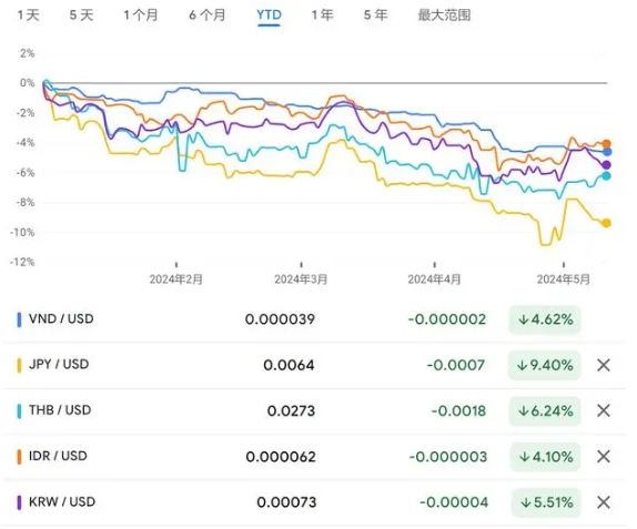 彭博社分析稱,在美國利率高企且美聯(lián)儲降息預期減弱以及地緣政治局勢不斷升級的情況下,美元一路走高,越南正與諸多亞洲國家一樣面臨貨幣貶值。越南盾之外,日元、印度盧比、印尼盾、泰銖、馬來西亞林吉特、菲律賓比索等亞洲貨幣均持續(xù)走出下行曲線。