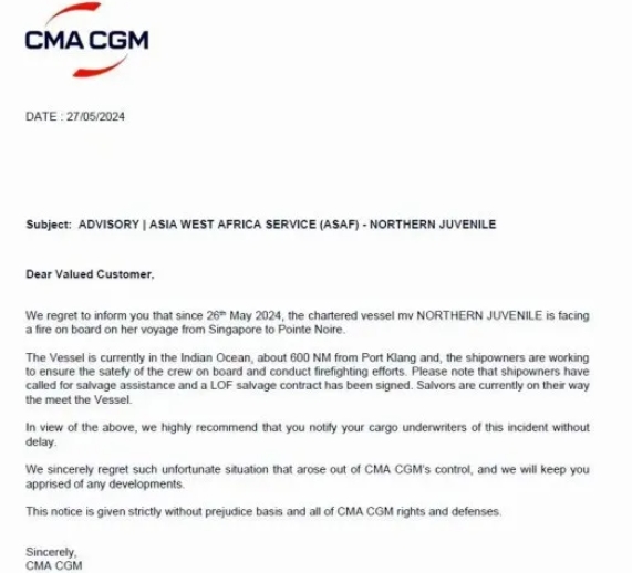 5月27日,達(dá)飛發(fā)布公告稱,自2024年5月26日以來,其租賃“NORTHERN JUVENILE”號(hào)集裝箱船在從新加坡駛往黑角航行的途中發(fā)生火災(zāi)。