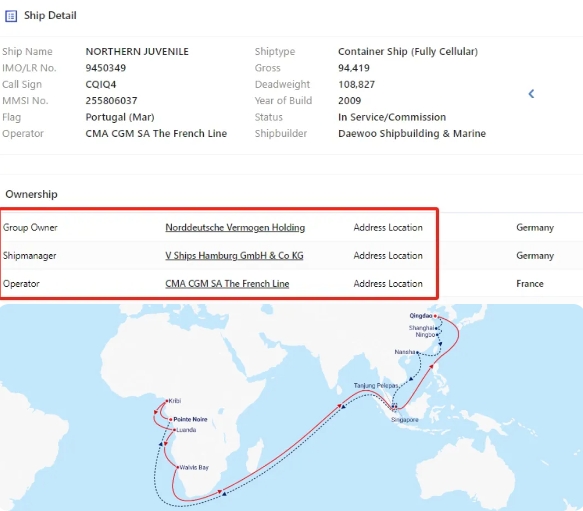 同時(shí)船視寶數(shù)據(jù)顯示,該輪船東為德國(guó)船舶融資公司Norddeutsche Vermogen,船管公司為德國(guó)V.Ships Hamburg GmbH公司,懸掛葡萄牙國(guó)旗,建造于2009年,運(yùn)力8811TEU,部署在達(dá)飛的亞洲至西非的ASAFGR(Asia West Africa Service)航線。