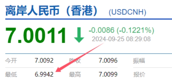 9月24日,在岸人民幣較上一交易日漲202個基點,收于7.0318;離岸人民幣漲近500點,收盤報7.01元,為2023年5月以來最高。