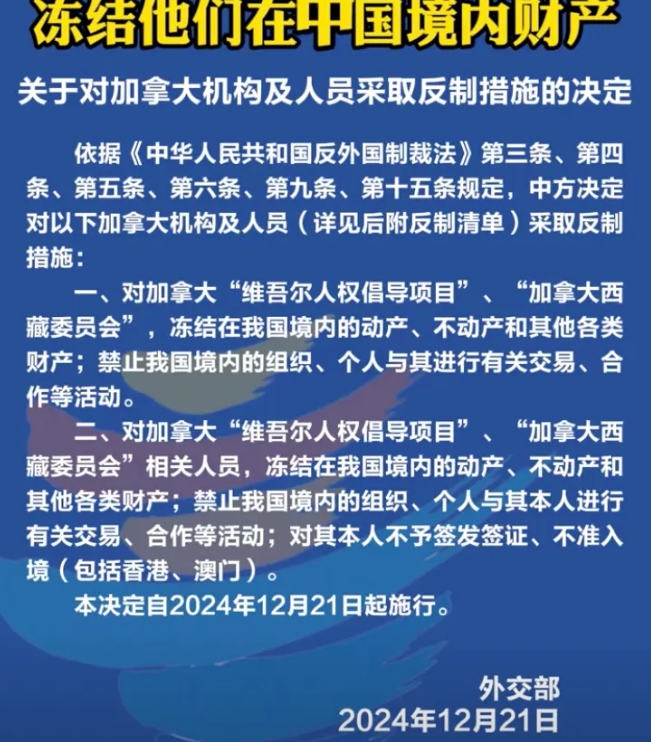 一、對(duì)加拿大“維吾爾人權(quán)倡導(dǎo)項(xiàng)目”、“加拿大西藏委員會(huì)”,凍結(jié)在我國(guó)境內(nèi)的動(dòng)產(chǎn)、不動(dòng)產(chǎn)和其他各類(lèi)財(cái)產(chǎn);禁止我國(guó)境內(nèi)的組織、個(gè)人與其進(jìn)行有關(guān)交易、合作等活動(dòng)。