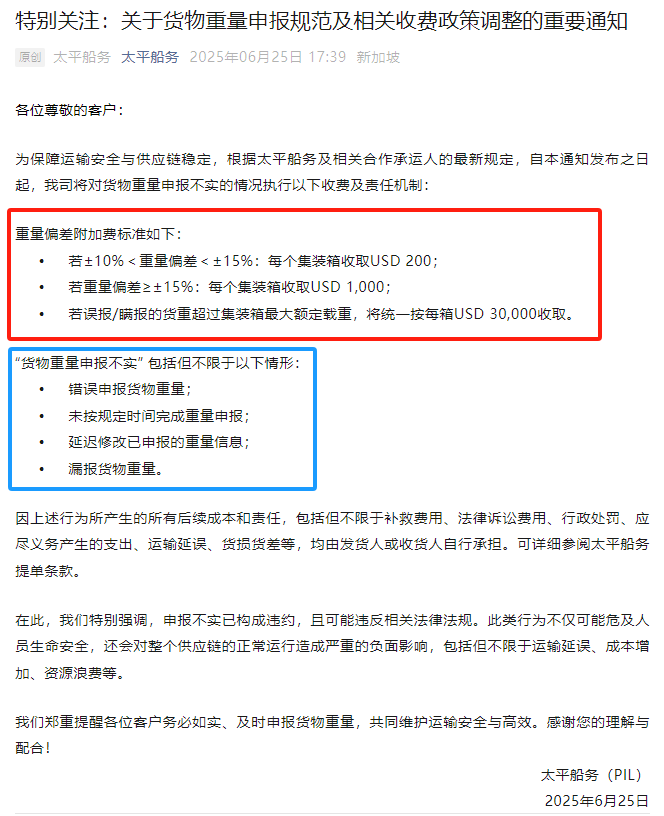 繼萬海航運6月16日發(fā)布通知,重申客戶須如實正確申報貨物,若存在瞞報、漏報、錯報等申報不實行為,承運人將按運輸合同約定向貨方收取每單位10萬美元違約金后;6月25日,新加坡船公司太平船務(wù)PIL發(fā)布重要通知,為保障運輸安全與供應(yīng)鏈穩(wěn)定,依據(jù)公司及相關(guān)合作承運人最新規(guī)定,自通知發(fā)布日起,將對貨物重量申報不實情況執(zhí)行收費及責(zé)任機(jī)制。重量偏差附加費標(biāo)準(zhǔn)明確:若重量偏差在±10%至±15%之間,每個集裝箱收取200美元;若偏差≥±15%,每個集裝箱收取1000美元;若誤報/瞞報貨重超過集裝箱最大額定載重,統(tǒng)一按每箱30000美元收取。