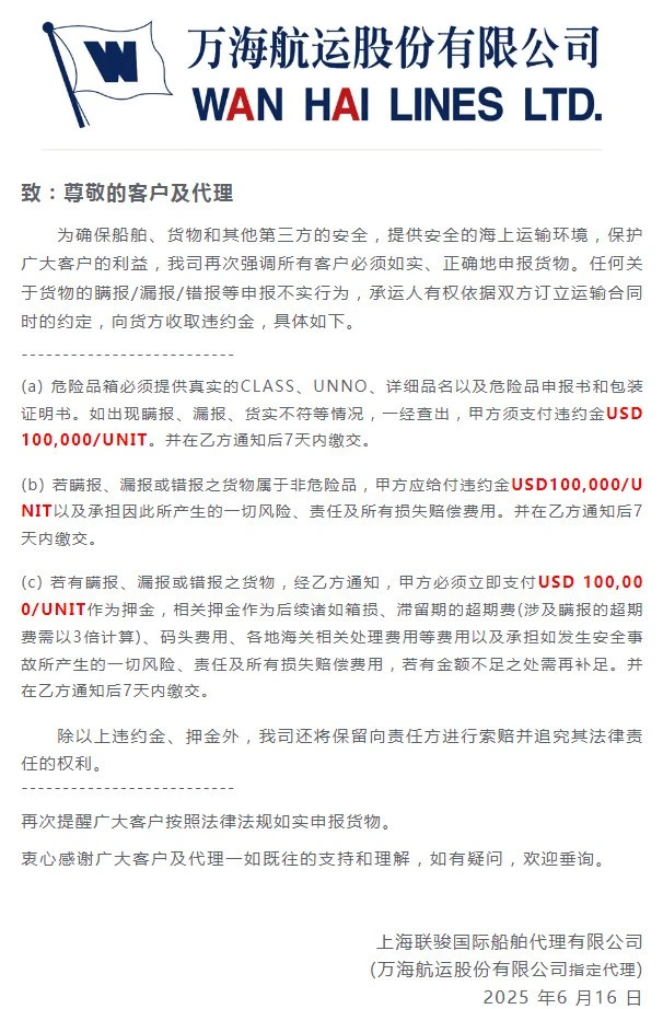 6月15日,萬海航運首次發(fā)布關(guān)于“WAN HAI 503”輪火災(zāi)事件的官方情況說明。值得注意的是,6月16日萬海航運再發(fā)通知,強調(diào)所有客戶必須如實、正確地申報貨物,若存在瞞報、漏報、錯報等申報不實行為,承運人將按運輸合同約定向貨方收取每單位10萬美元違約金。