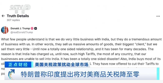 當(dāng)天,特朗普在其擁有的“真實(shí)社交”平臺(tái)上發(fā)文稱,多年來(lái)印度向美國(guó)輸出大量商品,而印度對(duì)美國(guó)商品進(jìn)口量卻相對(duì)很少,這主要是因?yàn)橛《汝P(guān)稅實(shí)在太高,這完全是一場(chǎng)單方面災(zāi)難。