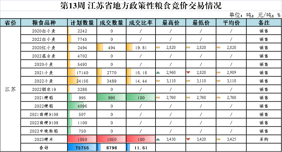 中儲糧江蘇分公司公益專場交易,采購2022年產(chǎn)中晚秈稻0.29萬噸,采購價2830元/噸,全部流拍;銷售2020年產(chǎn)粳稻0.25萬噸,全部成交,成交均價2670元/噸;購銷雙向交易中晚秈稻1.12萬噸,其中,銷售2021年產(chǎn)中央儲備小麥0.56萬噸,全部成交,成交均價2801元/噸,采購2023年產(chǎn)中晚秈稻0.56萬噸,全部成交,成交均價2800元/噸。