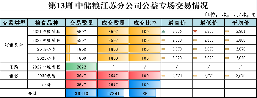 本周共有4場中儲糧江蘇分公司公益專場交易,其中1場為競價銷售專場,1場為競價采購專場,2場為購銷雙向?qū)?,具體分品種、分年份成交情況如下: