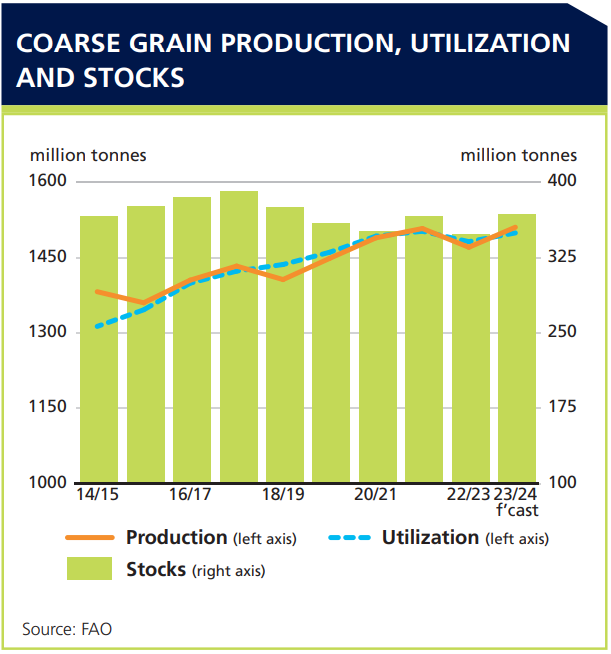 近10年全球粗糧產(chǎn)量、利用量及庫存量變化圖。©糧農(nóng)組織