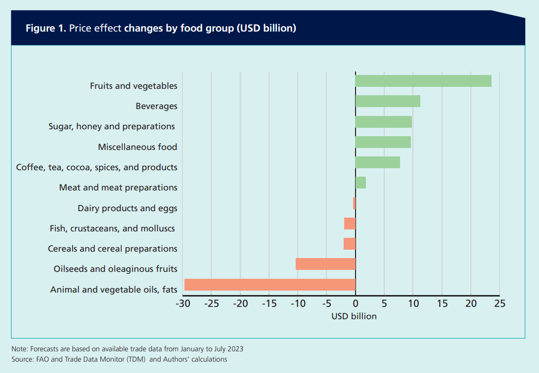 其中,水果、蔬菜以及飲料和食糖對增量的貢獻(xiàn)顯著,其進(jìn)口量的增長則主要由高收入和中高收入國家推動。相比之下,低收入國家的糧食進(jìn)口總額預(yù)計將減少11%。這些變化往往可以反映世界價格趨勢:本年度水果、蔬菜和食糖的國際報價猛漲,而動物油與植物油的報價則有所下降。盡管如此,全球糧食進(jìn)口賬單上進(jìn)口量的變化帶來的影響預(yù)計大于價格變化的影響,不過咖啡、茶、可可和香料等高價值或加工產(chǎn)品除外。